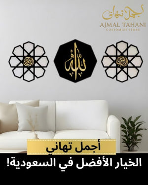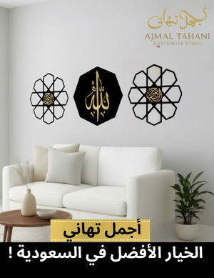 A premium 3-piece Islamic wall art set featuring Allah (ﷻ) in elegant gold calligraphy on a black center panel, complemented by two geometric floral side panels. A perfect blend of modern design and spiritual elegance for Saudi homes.